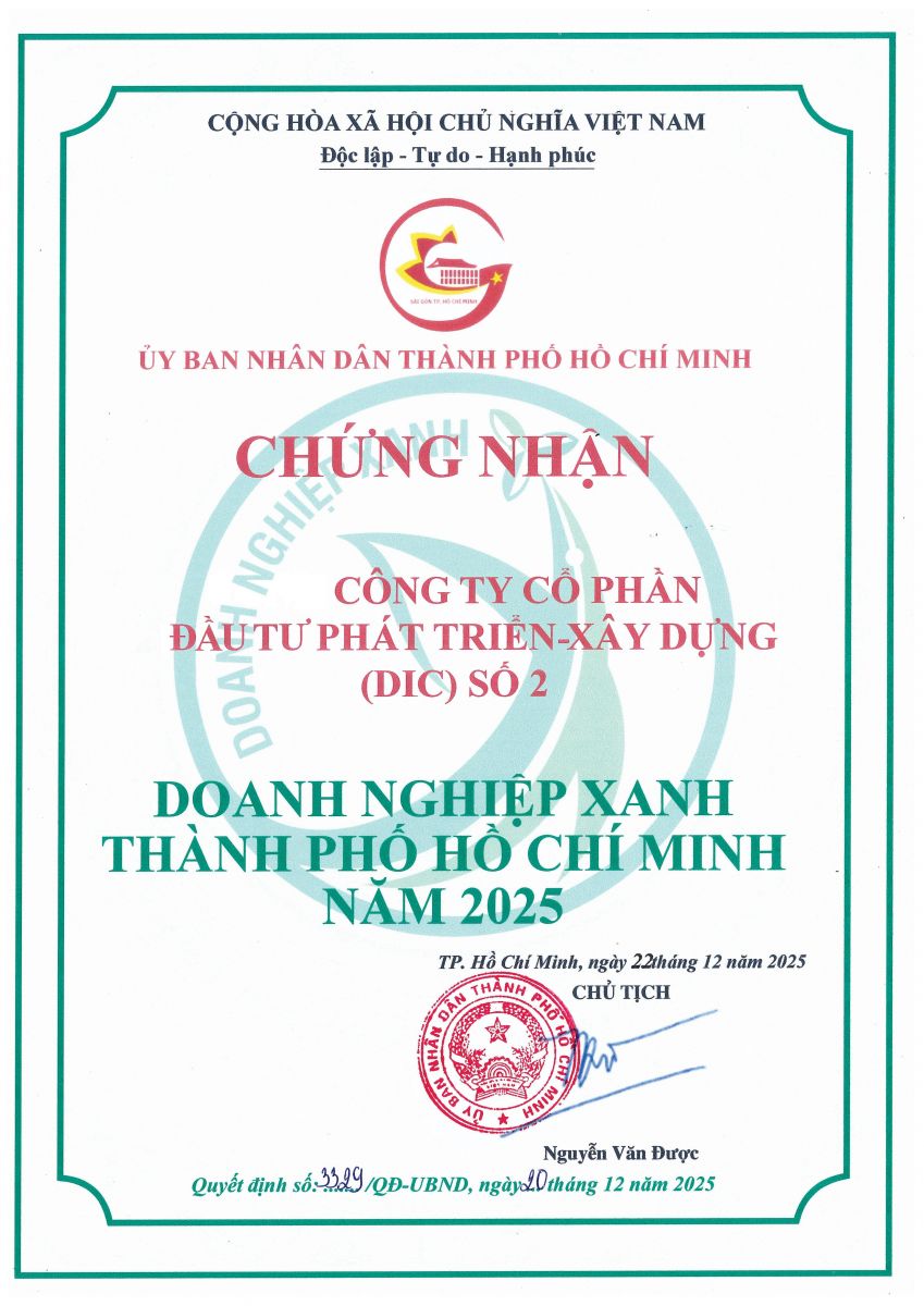 Năm 2025 đánh dấu một cột mốc đặc biệt trong hành trình phát triển của DIC No.2 khi doanh nghiệp vinh dự được công nhận danh hiệu “Doanh nghiệp Xanh Thành phố Hồ Chí Minh” năm 2025. Danh hiệu này không chỉ là sự ghi nhận cho những nỗ lực không ngừng nghỉ trong: